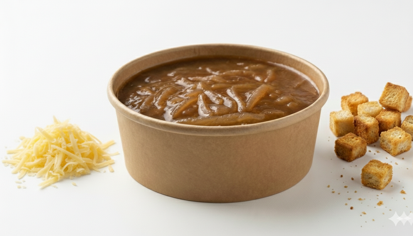 מרק בצל + גבינה צהובה + קרוטונים